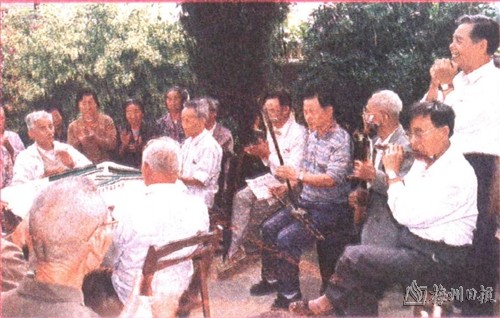 兴宁市福兴镇党委组织老人协会成员运用山歌演唱形式,进村入户,宣传『三个代表』。