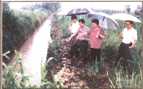 梅江区各镇和办事处积极为群众解决热点、难点问题。图为三角镇党委书记廖秀芬和干部冒雨检查上坪村排灌圳。该圳道是十多年来都没有解决好的历史遗留问题。