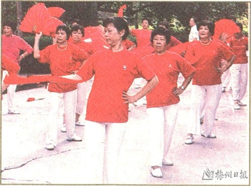 梅江区积极开展社区文体活动,丰富活跃城乡群众精神文化生活。图为一群妇女在跳扇舞。