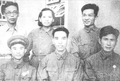 全国解放后,中共中央华南分局决定在梅、兴、丰、华、埔、蕉、平七县成立中共兴梅地委。地委书记王维(前排中)、组织部长廖伟(前排右)、宣传部长梁集祥(后排右)、财经委主任陈明(后排左)。同时成立兴梅军分区,王维兼政委、王立朝为副政委(前排左)。后排中为温碧珍,她从越南回梅县疗养。
