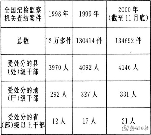 2000年3月8日,原江西省副省长胡长清因索贿受贿544万余元,行贿8万元,巨额财产161万余元不能说明合法来源而被枪决。2000年7月31日,原全国人大常委会副委员长,曾任广西壮族自治区主席的成克杰因收受贿赂合计4109万余元被判死刑。从而再一次表明党的第三代领导集体严惩腐败的强大决心。