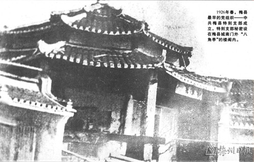1926年春,梅县最早的党组织——中共梅县特别支部成立,特别支部秘密设在梅县城南门外“八角亭”的楼阁内。