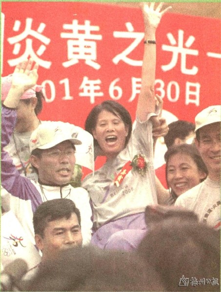 6月30日,参加“北京奥运·炎黄之光一海峡两岸长跑”活动的选手抵达终点北京,在朝阳公园与数千名市民共同跑完最后一站,为北京申奥助威。此活动自6月16日在台北起跑,途经高雄、深圳、宁波、杭州、上海、无锡、南京、青岛等地。图为来自中国台北的著名运动员纪政(中)、横渡世界十二海峡的游泳名将王瀚(右)等抵达终点后欢呼。 (新华社传真照片)