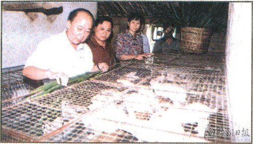 蕉岭华侨农场致力提高家庭农业整体水平,向优质化、基地化、产业化方向发展。图为农场党委书记、场长苏玉珠(左一)与农业部门负责人到养兔专业户家了解养殖情况。据悉,该养兔专业户以养中国名种家兔为主,单项月纯收入逾2000元。