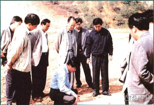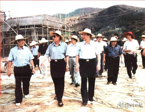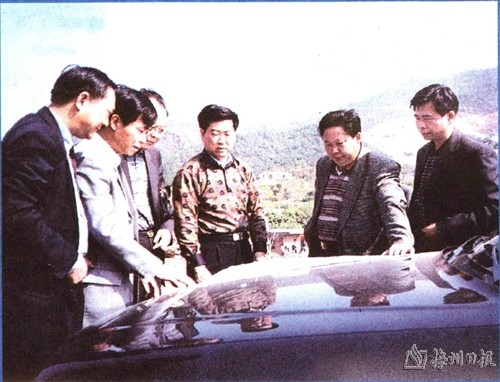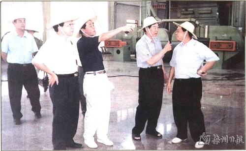 | 广东省烟草专卖局局长、广东烟草公司总经理黄永东(前排右二),梅州市委书记谢强华(前排右一),市长魏潘尧(前排左一)在该公司建设工地检查指导工作。 |