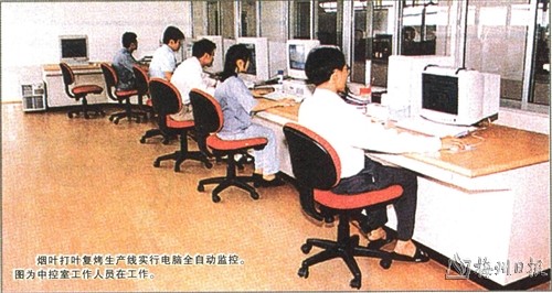 | 烟叶打叶复烤生产线实行电脑全自动监控。图为中控室工作人员在工作。 |