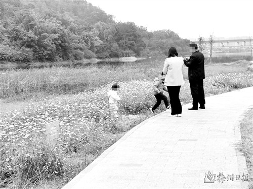 右图:梅城泮坑风景区临水一带,有家长无视警示牌,带着孩子跑进草地里拍照、玩闹。