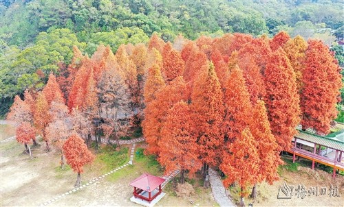 本报讯 (记者刘晓娟)又是一年水杉红。自入秋以来,在梅城泮坑旅游风景区,高大挺拔的水杉完成了从翠绿到金黄、橘红的渐变。色彩层次丰富的水杉林仿佛一幅浓墨重彩的天然油画,在阳光照射下散发出柔柔的光泽,呈现一派迷人的暖冬风光(如上图,高讯摄),前来赏景的市民游客络绎不绝。大家或是驻足拍照,或是与水杉合影,用手机留下冬日里这醉人的一抹红。