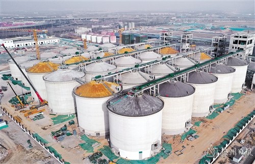 近日,中央储备粮秦皇岛直属库有限公司海港粮食储备基地项目一期工程主体结构施工完成,二期工程全面封顶。据介绍,该项目总占地550亩,设计粮食储备仓总仓容81万吨,主要建设粮食储备仓及相关附属设施。(新华社发)