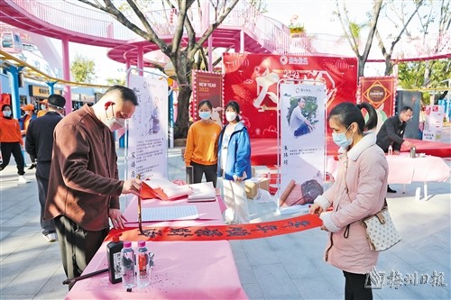 本报讯 (记者郑炜梅)写春联、送福字是我国传统节日春节的一项重要活动。日前,多名文艺志愿者走进梅城嘉印拾光,现场免费为市民写春联、送福字,以“文化年货”为群众送上新春祝福(如下图,高讯摄)。