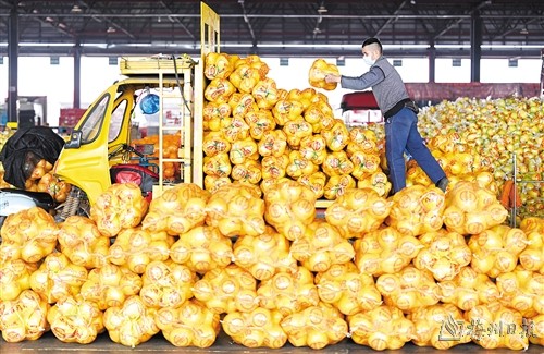 1月9日,在广西柳州一家农产品批发市场水果交易区,工人正在装运水果。