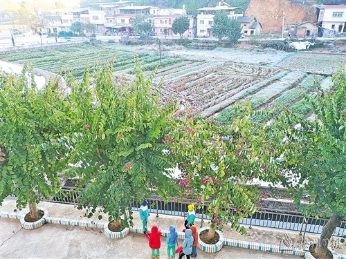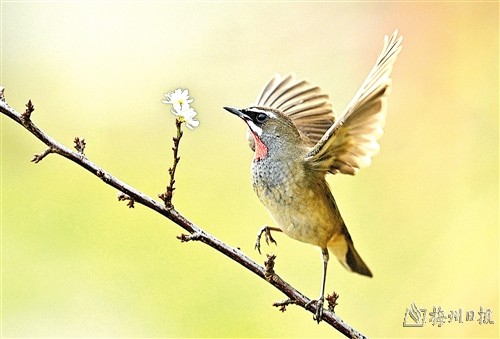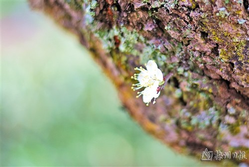 梅花开了。一只小鸟飞过来,对着小花儿左看右看。冬将春天轻轻呼唤……