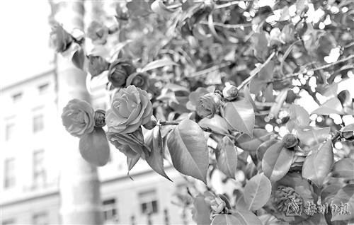 在城南一处花圃中,密匝匝的山茶花正炽烈地盛放着(见右图,丘林强摄),远看像极了一团正在燃烧的火焰。走近看,茶花叶子边沿有许多整齐有规则的锯齿,翠绿欲滴;茎是枯干的,可以隐隐地看出一点红棕色;还有不少花骨朵儿或严严实实地包着,或捂着羞涩的脸蛋,含苞待放,蓄力展示自己最风姿绰约的那一面。用“树头万朵齐吞火,残雪烧红半个天”形容其最恰当不过。