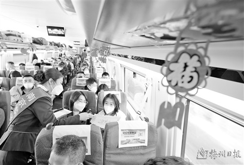 当日,中国铁路上海局集团有限公司南京客运段高铁二车队在D376次列车上开展“回家路上的笑容”绘画活动,列车员现场为旅客作画,送上新年祝福。 (新华社发)