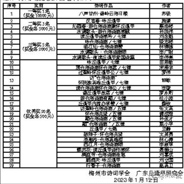 自2022年7月底至11月20日期间,大赛共征集到近800份参赛作品,日前由中华诗词部分编委、广东中华诗词学会、岭南诗社常务理事和梅州市诗词学会有关人员组成的评审小组认真评审,最终评出一等奖1名,二等奖3名,三等奖5名,优秀奖20名。现公布梅州市“仓海诗廊杯”诗词大赛获奖作品名单如下: