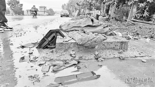 近日,记者在G206线梅江区城北镇扎下村路段看到,路边的水泥路面已破开,形成数百米的坑槽,有数十厘米深,里面放有线缆,每隔一段距离有一个路灯水泥基座,开挖出来的土块、水泥块等施工废料则被放置在一旁,周围缺少明显警示标志。此外,记者发现,道路一旁还有一些高出路面约五六厘米的井盖,井盖边缘未做处理,且放置的警示物已损坏,存在较大安全隐患。