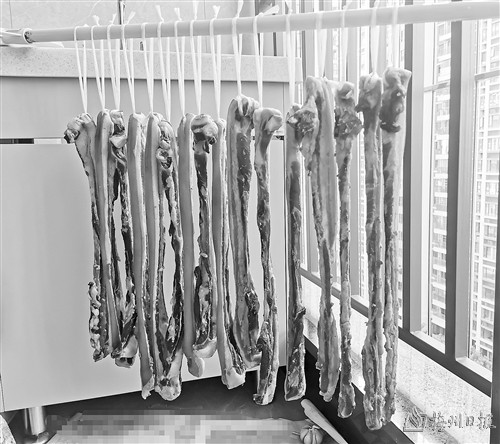 左图:一些市民在家中自制腊肉,根据过年用餐人数控制食材数量。(朱绮辉 摄)