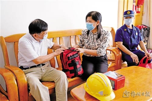 “肖叔,这是我们给您家准备的家庭应急包,里面有安全绳、应急保温毯、多功能锤等等,您来看看。”2022年8月底,梅州市安全宣传进家庭活动在梅江区江南街道中心坝社区金碧华府小区举行。市应急管理局、市消防救援支队和燃气公司的工作人员一起上门走访住户,向他们发放了《全面应急知识手册》《安全宣传“五进”家庭篇》《燃气安全知识卡》等资料和家庭应急物品。根据夏季高温天气骤增、安全隐患增多的特点,工作人员详细讲解了防溺水、家庭用火、用电、用气、急救与逃生等安全要点,解答了居民对安全、急救自救互救安全、防灾减灾应急安全知识的相关问题,宣传防灾减灾知识的同时入户进行用电、用气隐患排查,帮助消除安全隐患,确保居家安全。