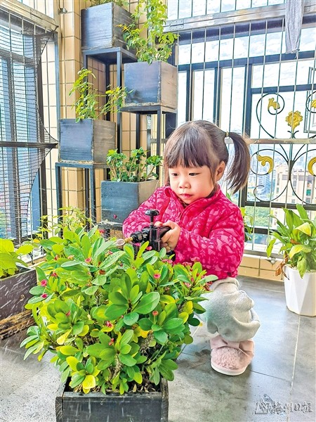 家住客天下的陈晓霞是一名水彩画家,在她家中有一个“梦幻花园”,种满了月季、绣球、风车茉莉、向日葵等各种花卉,她每天都会花一段时间在小花园里打理,观察了解植物的构造。“因为喜欢跟大自然接触,加上我是画水彩花卉的,所以在阳台上打造了一个小花园,这为我的绘画也提供不少素材灵感。”陈晓霞表示,养花,是一种心情,也是一场修行,可以陶冶情操以及性情,新芽吐露、花朵娇嫩、花园四季变幻,都能让人看到希望。“待到春暖花开之时,小小花园生机盎然、香气四溢,而我的心情也随之欢喜,备受鼓舞。”陈晓霞对春天充满了期待。大人如此爱花,小孩亦如是。家住三乡社区的3岁小朋友吴佩霖同样也对花充满了喜爱,她时常待在阳台上给花浇水,观察它们从发芽到开花结果的生长过程,感受生命的神奇。