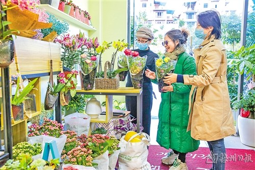 记者走访梅城发现,近年来,梅城新开了好些花店,这不,鸿都路最近又有一家新花店“忘忧花谷”开张,吸引了附近不少居民前往选购。在碧桂园,一家名为“园丁之家”的花店店主黄芳菲也是某培训机构的一名老师,她坦言,花店已开了六年,这些年受疫情影响效益并不太好,但开花店也不全然为了赚钱,主要是自己喜欢花,看到花就满心欢喜。