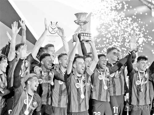 当日,在沙特阿拉伯利雅得进行的2023西班牙超级杯决赛中,巴塞罗那队以3比1战胜皇家马德里队,夺得冠军。 (新华社发)