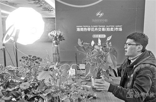 1月18日,在海南热带花卉交易(拍卖)市场,该市场抖音电商运营团队的主播在直播介绍热带花卉。