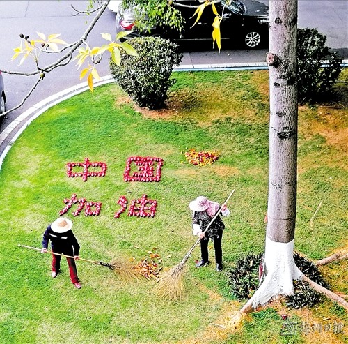 2020年春,新冠肺炎疫情暴发,全国上下众志成城,共同抗疫。这是我无意中朝办公室窗外看到的一幕:两位园林环卫工人用花朵拼成的“中国加油”的图案。 (汤伟青拍摄于2020年) |