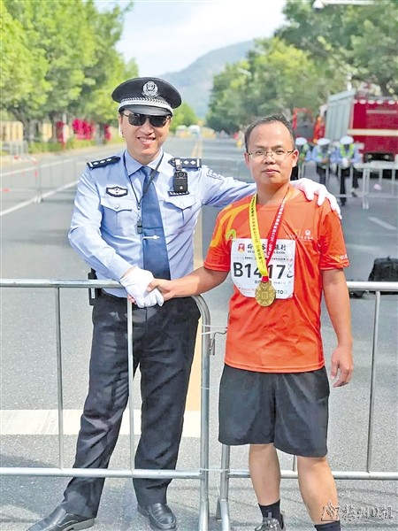 | 11月3日,第一次用双脚丈量了42.195公里。因为坚持,因为努力,冲过终点的那一刻我认为自己是华丽的,尽管被很多人超越了,但我已经做到了很好的自己。虽然同学的你比我帅,但那一刻,我认为我可以和你比肩。(郭炜漂拍摄于2019年) |