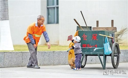 | 偶然经过兴宁市会展中心,看到一个约2岁的小朋友捡起地上的广告纸交给环卫工人,我马上拿起相机抓拍下了这个感人的瞬间。(袁火坤拍摄于2018年) |