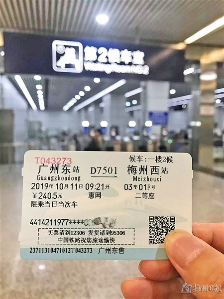 | 10月11日,刚好出差广州准备返梅,适逢梅州开通高铁,抢到广州东站开往梅州西站的第一趟动车。(孤客拍摄于2019年) |