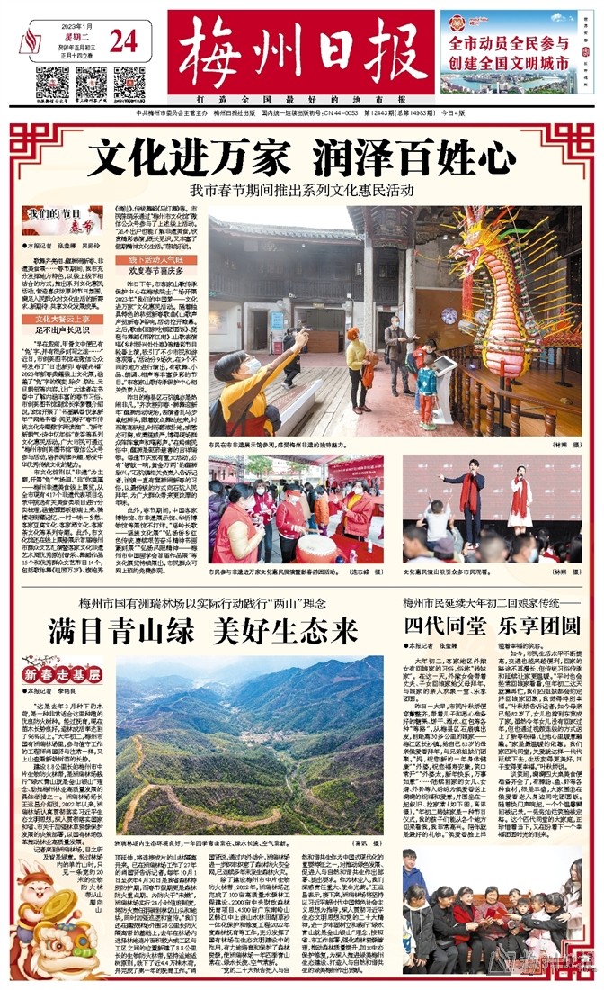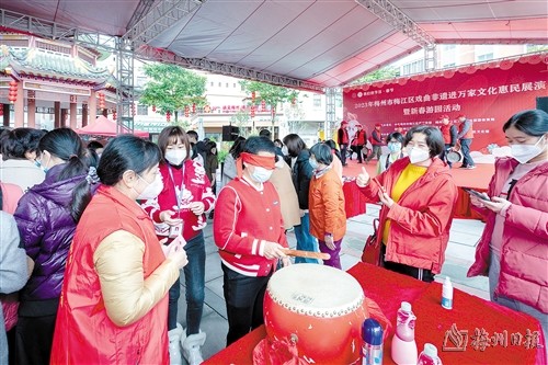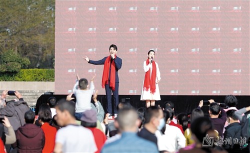 昨日下午,市客家山歌传承保护中心在梅城院士广场开展2023年“我们的中国梦——文化进万家”文化惠民活动。随着独具特色的恭贺新春歌曲《山歌声声贺新春》唱响,活动拉开帷幕。之后,歌曲《回家吃顿团圆饭》、琵琶与舞蹈《雨碎江南》、山歌表演唱《乡村振兴处处春》等精彩节目轮番上演,吸引了不少市民和游客观看。“活动分9场次,在9个不同的地方进行演出,有歌舞、小品、朗诵、相声等丰富多彩的节目。”市客家山歌传承保护中心相关负责人说。