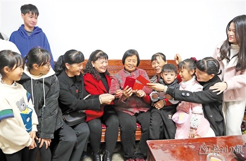 昨日一大早,市民叶秋娇便穿戴整齐,带着儿子和悉心准备好的糖果、饼干、酒水、红包等各种“等路”,从梅县区石扇镇出发,到距离30多公里的娘家——梅江区长沙镇,给自己82岁的母亲侯爱香拜年,与兄弟姐妹们团聚。“妈,祝您新的一年身体健康”“外婆,祝您福寿安康,笑口常开”“外婆太,新年快乐,万事如意”……陆续到家的女儿、女婿、外孙等人纷纷为侯爱香送上满满的祝福和爱意,并围坐在一起叙旧、拉家常(如下图,高讯摄)。“年初二转妹家是一种节日仪式,我的孩子们能从各个地方回来看我,我非常高兴。陪伴就是最好的礼物。”侯爱香脸上洋溢着幸福的笑容。