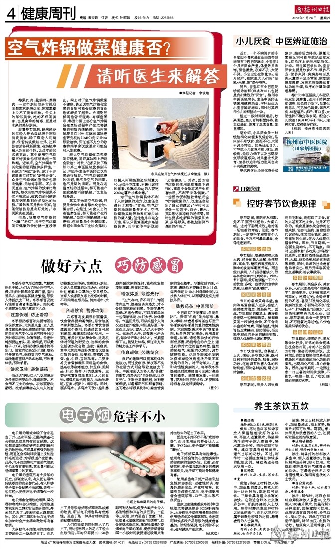 对于空气炸锅具体不利于人体健康的地方,江主任也进行了解答:“首先,空气炸锅的油脂热量并不少。空气炸锅确实能帮助我们减少油脂的摄入量,但他也并非完全无油,所以只能算是减少高油脂伤害,而非宣传中所说的‘无油健康’。其次,因为空气炸锅的使用是在高温下进行的,高温中食物容易产生有害物质,不利于身体健康。”一些因为便利性较常使用空气炸锅做菜的人,江主任也给出了自己的建议:“平时可以多煲一些莲子、百合、薏米、芡实等这类凉润的汤来喝,同时也要多吃新鲜的蔬菜和水果,多喝绿茶,都能起到调节身体的作用。”
