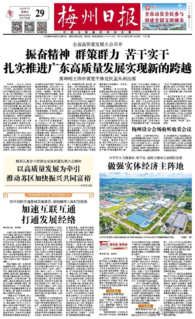 黄坤明在讲话中指出,在农历新春开工第一天,在这开耕的时节,我们召开全省高质量发展大会,就是要牢记总书记殷殷嘱托,接续先烈先辈先贤的奋斗,擂起新时代聚力推动高质量发展的金鼓,奏响广东奋进新征程走在前列、当好示范的强音,以新担当新作为奋力实现广东现代化建设新的跨越。自古以来,广东人民在岭南大地上繁衍生息、薪火相传,一路耕耘、一路向前,书写了波澜壮阔的历史篇章。特别是改革开放以来,广东以“敢为天下先”的担当“杀出一条血路”,率先改革开放,率先创办经济特区,取得举世瞩目的发展成就。在生生不息的传承中,这片革命热土、改革热土、发展热土不断演绎精彩、书写传奇,在历久弥新的演进中始终充满魅力、绽放活力。