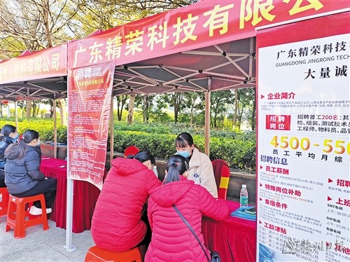 有年终奖、高温补贴、节日津贴、公司免费提供食宿、入职购买“五险一金”……上午9时招聘会开始后,各家企业“诱人”的福利待遇吸引大量求职者前来咨询。家在五华县城的小伙洪炎梓早早来到现场,通过认真咨询了解,在位于县城工业园区的广东精荣科技有限公司求职登记表上填写了个人信息。“选这家公司主要是专业对口,离家近,待遇也不错。”洪炎梓说,这样的招聘会对促进就业有很大的帮助。