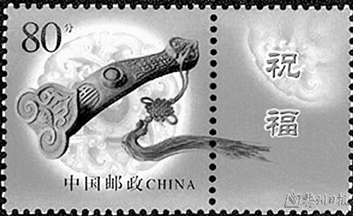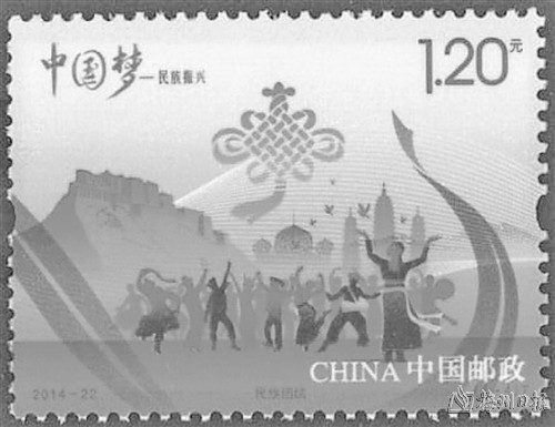 2002年5月10日,中国邮政发行了《如意》个性化服务专用邮票一枚(图①)。主票图案为如意柄端系着一个红色“中国结”;2003年3月3日,中国邮政发行了《同心结》个性化服务专用邮票一枚,主票图案为盘长结四边编织有心型绳结的同心结;2006年9月25日,中国邮政发行了《中华全国归国华侨联合会成立五十周年》纪念邮票一枚,图案背景画面为淡淡的粉红色“中国结”,寓意归国华侨与全国人民血肉相连,同心同德共同建设美好家园;2013年8月8日,中国邮政发行一枚《美好祝福》贺卡专用邮票,图案为象征喜庆的红色“中国结”;2014年9月20日,中国邮政发行《中国梦(二)——民族振兴》特种邮票,其中第四枚“民族团结”(图②),图案中载歌载舞的各民族群众上方有一个大红的“中国结”,象征着各民族大团结。2019年1月10日,中国邮政发行了《拜年》特种邮票一套1枚(图③),邮票图案背景下方衬以五个相互连接的大红色“中国结”。