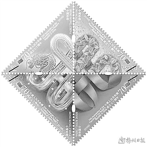 中国香港邮政于2019年10月1日发行的《中华人民共和国成立七十周年》特别邮票(图④),该套邮票造型别致,设计单枚为三角形,四枚可组合成一个菱形,拼出精巧的“中国结”图案 。邮票图案还融合了国旗、舞龙等元素,具有浓浓的节日气氛,寓意团结、吉祥、和谐。