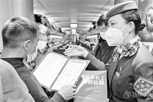 1月30日,在阜阳开往上海的G7445次列车上,铁路上海客运段乘务人员向旅客介绍长三角务工招聘信息。