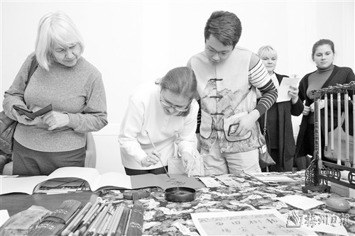 1月30日,在俄罗斯圣彼得堡凯瑟琳礼堂,当地市民体验中国书法。