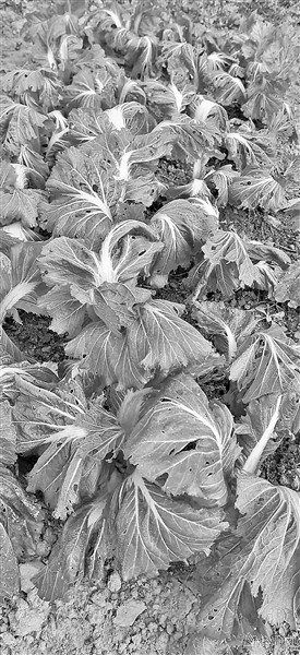 去年冬至前三天的山谷,夜里温度骤降到-3℃左右,此时若是有雨的话定能雪花飞扬。清晨起来,四周一片白茫茫,从屋顶到地面都笼罩在霜白世界里,石臼中的水也已凝固成厚厚的冰块。菜地里的菜更是一片狼藉,全都蔫巴得像煮熟了似的。