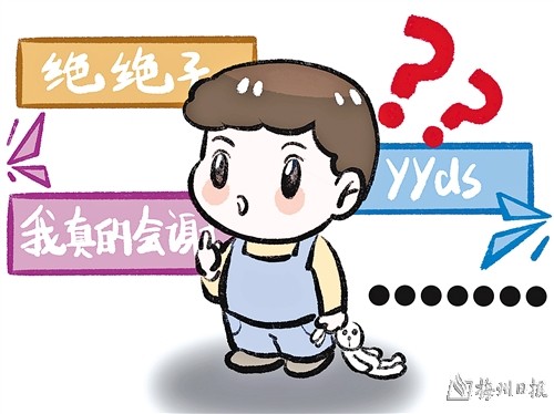 记者采访发现,大多数家长和老师都表示,网络用语已经渗透到孩子们生活的方方面面。“我带娃去小区里的游乐园区玩耍,要是有谁摔倒了,就经常能听到一群孩子扯着嗓子喊‘完了,芭比Q了’。那群孩子也就刚上小学的样子。”二年级学生家长谢新安回忆说,他平日里也经常听儿子说“yyds(永远的神)、ssmy(盛世美颜)、dbq(对不起)”等缩写式网络词语,儿子告诉他,这些词汇都是学校学生交流时的流行用语,谁要是不懂什么意思,就out(落伍了)了。
