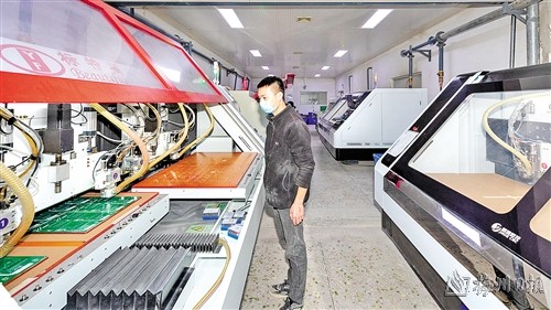 另一边,在位于蕉华工业园区的梅州市鸿利线路板有限公司数控生产车间,经过技改的双面多层电路板生产线正快速运作,偌大车间内仅有一名工人。“技改升级后,机器自动化操作代替了更多人工操作,原先需要8天才能完成的订单现在只需3天,并且品质更稳,产品附加值更高。”鸿利公司行政经理黄国安告诉记者,该公司是一家长期从事生产智能机器人、5G发射塔工业电源以及逆变器配套印制电路板的广东省高新企业。近年来,企业持续加大科技研发投入,通过技改升级、精益生产的方式,保持了稳定的发展势头,实现连续三年营收逆势上扬。未来,该公司将狠抓企业转型升级,并以申报“专精特新中小企业”认证为契机,围绕“微、特、高”市场需求,推动“产学研用”深度融合,在优化现有存量市场的同时,对标大湾区先进制造行业需求,持续改进创新,延伸服务链条,努力打造县域制造业高质量发展标杆企业。