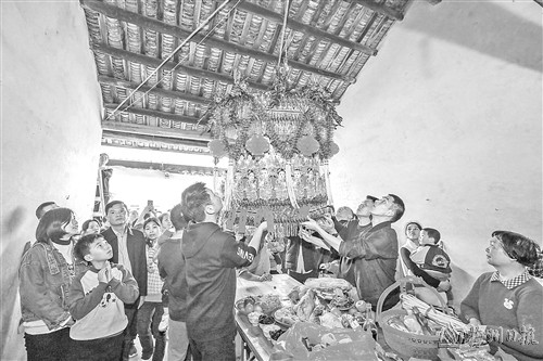 到达祖屋后,记者看到,上次赏灯升上去的花灯仍旧悬挂在梁上,新的花灯被庄重地摆放在桌上。蓝氏子孙依次将茶酒、肉等摆放好,并将写有新丁名字的红纸贴在新的花灯上。升灯前,上一年赏灯悬挂的花灯被取下,用于悬挂花灯的“长命绳”被分发给上一年添丁赏灯的人家。“赏灯开始……击鼓……高升……鸣炮……鸣锣……”伴随着锣鼓声,在新丁家人的托举下,崭新的花灯缓缓升起。“赏灯这天我们还会在家中设宴,邀请亲朋好友欢聚,庆祝添丁之喜。”蓝先生说。