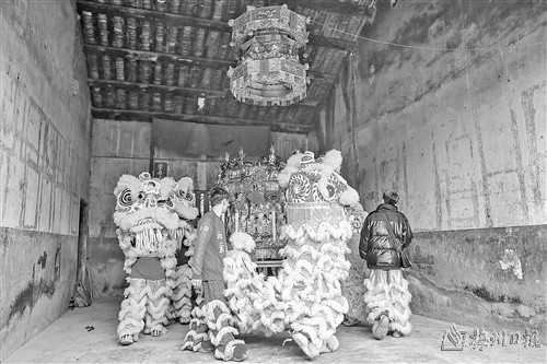 正月十三,水口镇布头村桅杆下、伯公塘、蓝塘下蓝氏早早就忙活了起来。“咚咚锵!咚咚锵!”只见一路舞狮相随,添了新丁的蓝氏子孙一边敲锣打鼓,一边挑着茶酒、肉、香烛等前往祖屋举行赏灯活动。“正月十一我们已将花灯请回,正月十三赏灯这天主要是祭祀、升灯,这就需要根据辈分开展。比如:十四、十五世的子孙,得先去第十世的祖屋祭祀、升灯,随后去第十一世的祖屋祭祀、升灯,最后才去第十四、十五世的祖屋开展。”蓝先生介绍道。
