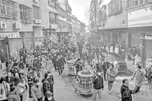 兔年正月初九(1月30日)下午,龙田镇磐石围人头攒动,袁氏请花灯活动隆重举行。现场锣鼓喧天、鞭炮齐发,来自袁屋的子孙手持彩旗,从磐石围祖屋出发,随着舞龙队前去迎接花灯。不少沿路的住户、商户纷纷在自家门前燃放鞭炮表示祝贺。抬花灯回祖屋途中,鞭炮声、锣鼓声更是一路不断,响声愈隆。将花灯抬回祖屋后,花灯被摆放在八仙桌上,舞龙围着花灯参拜祈福,升灯活动随即开始。“升灯开始!步步高升!财丁兴旺!老少平安!阖家幸福……”在声声祝福中,花灯缓缓升起,被悬挂至祖屋上厅栋梁下。“每年正月初九下午我们都会进行请花灯,正月十三赏灯,正月十八暖灯。如果有新丁,暖灯那天会进行分灯、抢灯。”磐石围袁氏一村民说。