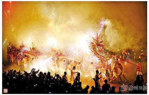 当口含金珠的火龙点燃,喷发而出的焰火划破夜空,绚丽夺目。在人们热烈的欢声笑语中,火龙被寄寓了希望,也寓意着祝福,期盼在新的一年,人民幸福安康,期盼的美好如期而至。(黄毓波)