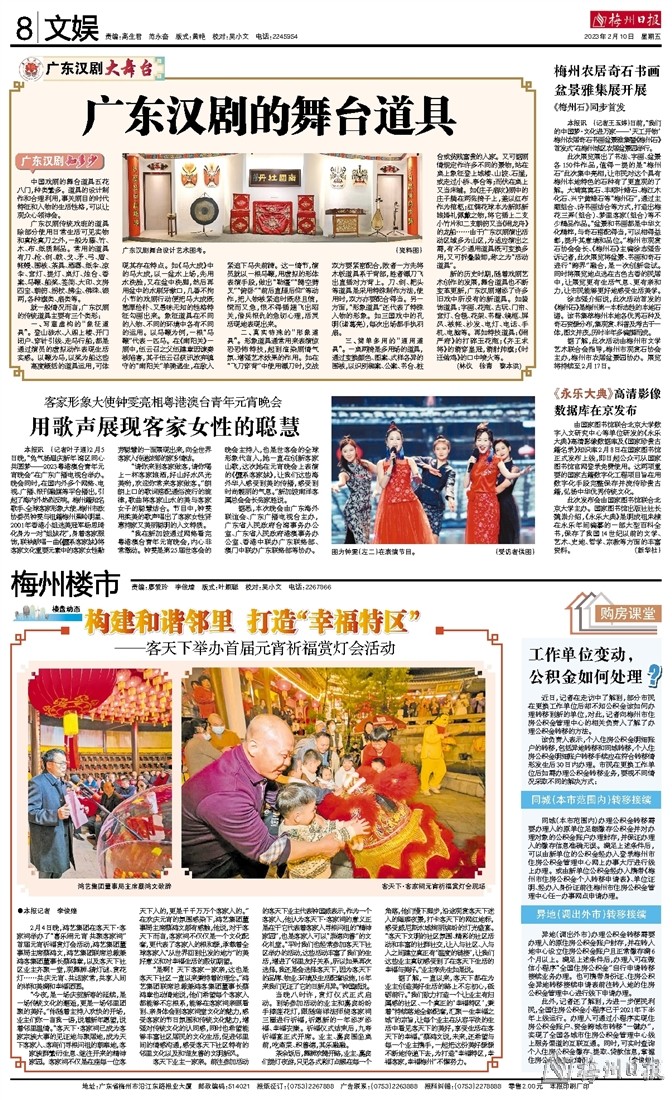 本报讯 (记者叶子通)2月5日晚,“兔气扬眉庆新年 湾区同心共圆梦——2023粤港澳台青年元宵晚会”在广东广播电视台举办。晚会同时,在国内外多个网络、电视、广播、报刊融媒等平台播出,引起了海内外热烈反响。梅州籍知名歌手、全球客家形象大使、梅州市政协委员钟雯与祖籍梅州蕉岭明星、2001年香港小姐选美冠军杨思琦化身为一对“姐妹花”,身着客家服饰,联袂献唱一曲《亻厓系客家妹》将客家文化重要元素中的客家女性勤劳聪慧的一面展现出来,向全世界客家人传递浓郁的家乡情结。