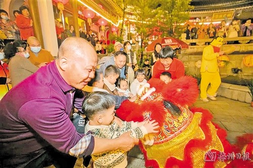 当晚八时许,赏灯仪式正式启动。到场参加活动的业主和嘉宾纷纷手捧莲花灯,跟随瑞祥法师绕客家祠三圈进行祈福,祈愿新的一年添岁添福、幸福安康。祈福仪式结束后,九寿祈福宴正式开席。业主、嘉宾围坐桌前,吃斋菜、积善德,其乐融融。