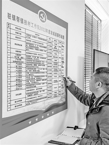 “攻城拔寨,挂图作战,精准帮扶,不落一诺。”工作队会议室内的白墙上,悬挂着一幅醒目的作战表。“这是去年的图表,我们不仅顺利完成了所有的目标任务,有的甚至还超额完成。”工作队队长裴敬中说。