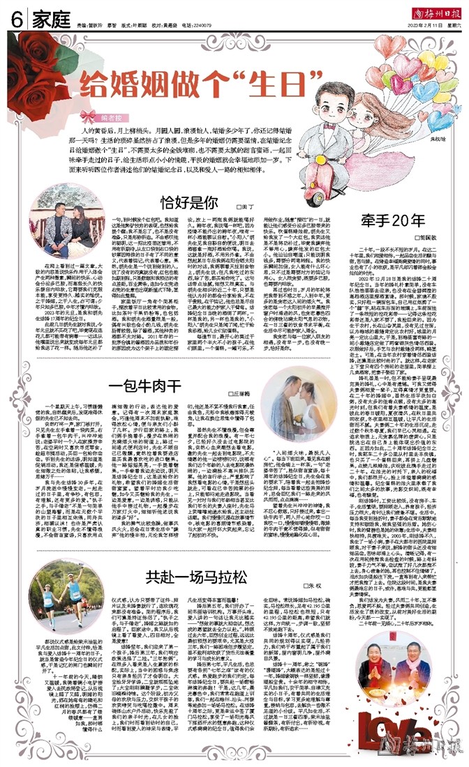 2022年12月28日是我的结婚二十周年纪念日。当年的婚礼朴素简单,没有车队浩浩荡荡去迎亲,也没有在金碧辉煌的高档酒店里摆酒宴请。那时候,家境不殷实,只好租一辆面包车,自己用红纸剪了一个“囍”字,贴在车后面的玻璃上,车前面挂了一条很短的拉花彩带——记得这条拉花彩带还是人家不要了,我捡回来的。因为生于农村,长在山旮旯里,没有见过世面,以为梅城的裁缝肯定比农村好,城里的月亮一定比山里大,于是,到梅县富奇路的一间小裁缝店定做了两套银灰色情侣西装。衣服做好后,手艺与农村裁缝没两样,略显老土。可是,在当年农村穿着情侣西装结婚,还算是比较时尚的了。就这样,在老家上下堂只有四个房间的老屋里,简单摆上几桌酒席,把妻子娶回了家。